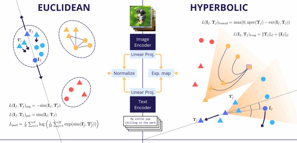 Hyperbolic geometry offers a natural mathematical framework for hierarchical data, with exponentially expanding volume that enables efficient embedding of tree-like structures. Recent work has demonstrated improved semantic entailment and image-text alignment using hyperbolic embeddings.