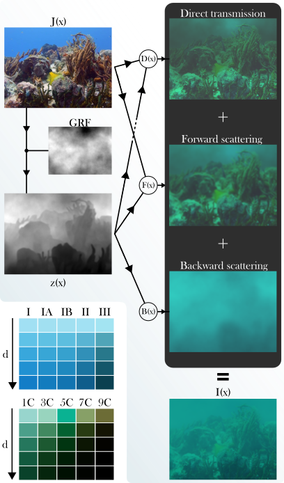 To fill these gaps, research has often turned to synthetic data. Particularly, the image formation model (IFM) has been used to simulate different underwater conditions on existing images. This can help increase the volume and variation of underwater data, which is particularly important for data-hungry deep-learning models.