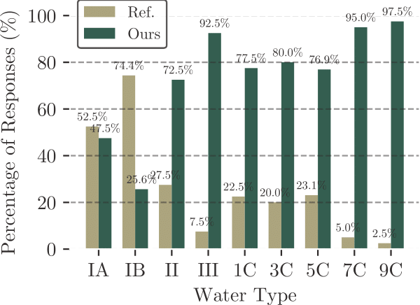 We qualitatively compared both our pipeline and the original model using the BUCKET data. We additionally generated synthesized images of real underwater scenes and collected survey responses on image realism. Our pipeline results in visually realistic underwater images, even under high turbidity conditions, and had an 82.5% selection rate by survey participants.